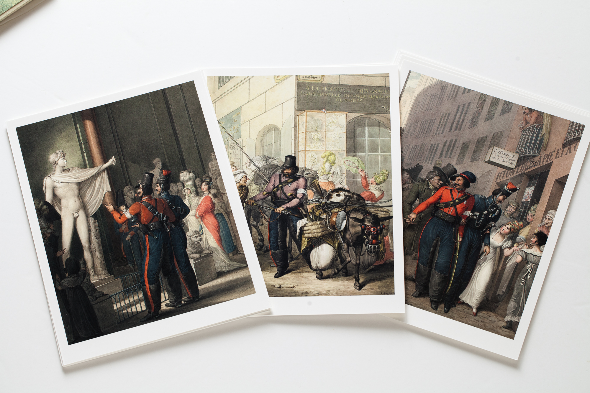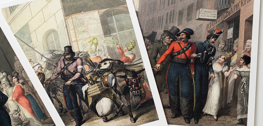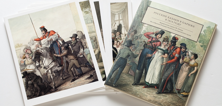 Акварельные рисунки художника Георга Эммануэля Опица (1775–1841) объединены темой "Казаки в Париже в 1814 году". Парижская серия акварелей насчитывает более 40 листов, в подарочный набор репродукций ГИМ вошли 24 работы художника. Они воссоздают образную картину победного окончания войны 1912–1814 гг., передают совершенно необычную атмосферу, воцарившуюся в городе после прихода русских. Видимо, военный лагерь в Париже был настолько необычным зрелищем, что художник стремился запечатлеть самые яркие события пребывания армии-победительницы в покоренной столице противника.