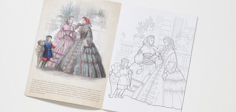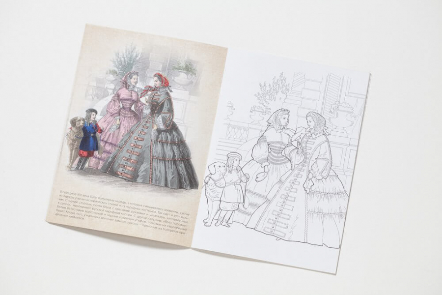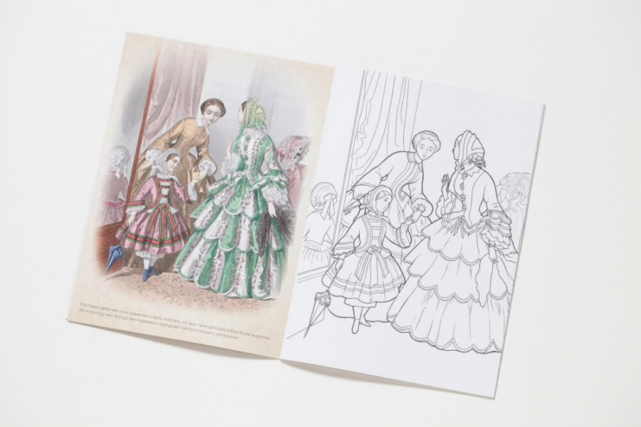 Каждый разворот представляет собой страницу для раскрашивания и репродукцию оригинальной работы.