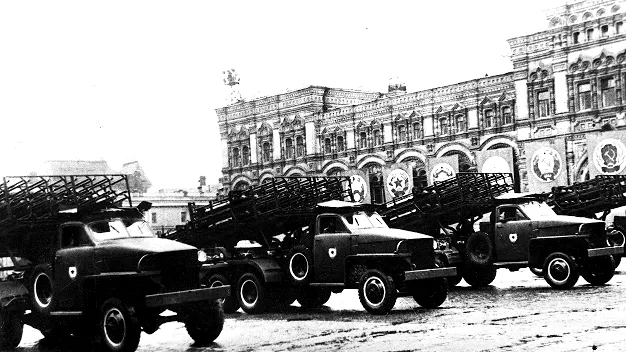 грозные реактивные установки в народе. На головной машине знамя